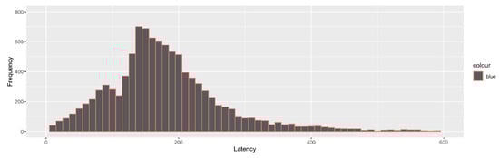 On each trial, the first saccade that originated within an imaginary square of 4° width around the fixation cross and landed within 4° of four target circles was considered. Three participants’ data were discarded because more than 25 % of their saccades landed more than 4° away from the target circles. From the remaining participants’ data, 9 % of trials were discarded based on this criterion. Saccade latency was defined as the time taken to initiate a saccade following the disappearance of the ACS signal. Frequency distribution of saccades (Figure 2) revealed two distinct peaks which are considered as a hallmark of the presence of two types of saccades: express and regular saccades (Fischer & Ramsperger, 1984; Fischer & Weber, 1993). Express saccades are those with a latency between 80 ms and 130 ms (15 % of the total saccades). Remaining saccades with the latency greater than 130 ms were considered as regular saccades. Saccades with latency less than 80 ms were discarded as being anticipatory (10.5 %). Separate analyses were performed on express and regular saccades. The upper limit for outliers among the regular saccades was calculated using the median absolute deviation (MAD) criterion as the more common method of discarding responses based on the standard deviation is considered to be not as effective in detecting outliers in smaller samples (Cousineau & Chartier, 2010; Leys, Ley, Klein, Bernard & Licata, 2013). Regular saccades with the latency greater than 2.5 MAD away from the median latency were discarded for each participant (10.7 %). On the remaining filtered trials, accuracy analysis was performed. Next, only those trials in which the saccades landed in the correct interest area (based on the spatial ACS of that trial) were considered for other analyses (88.28 %). The saccades could land in the relevant locations (correct saccades) or the irrelevant locations (categorised as errors). The saccades that landed correctly in one of the relevant locations could either be at the cued location or the opposite location.