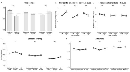 Results from Experiment 1 (A) There were more saccades to the relevant valid location at 33 ms and 50 ms SOA compared to relevant invalid location (B) The horizontal deviation of the saccade end location showed that saccades landed towards the cued locations at 33 ms and away from the cued locations at 100 ms SOA, only when the cues were relevant (C) but not when they were irrelevant (D) Facilitation followed by inhibition was observed in latency of saccades to the (relevant) cued location. But latency on IR invalid cue trials was faster compared to relevant invalid trials at 33 ms. This pattern was reversed at 100 ms SOA (E) Participants were less accurate on IR cue trials compared to no cue trials, accuracy on relevant cue trials was also greater compared to no cue. Note: The choice-rate and accuracy data are plotted in terms of proportion for ease of comprehension. The statistical analysis was performed on d’ values. The dashed horizontal line represents chance level (0.5).