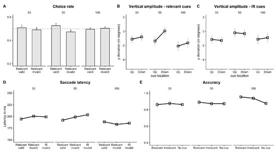 Thus, trials were categorised into four types as a function of the location of the cue and the landing position of the saccade: relevant valid cue (cue location matches the correct saccade end location), relevant invalid cue (cue location opposite to the correct saccade end location, in the relevant visual field), irrelevant invalid cue (cue location in the irrelevant visual field) and no cue. The results from the analysis of regular saccades are reported below. The express saccades analysis lead to mostly non-significant results and are reported in the supplementary material.