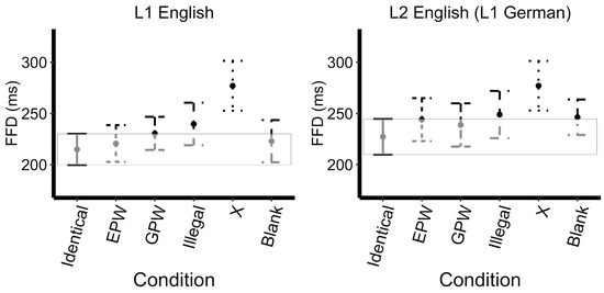 Likelihood-ratio model comparison revealed a main effect of mask type approaching significance (X2(5)=9.78, p=0.08), a main effect of language (X2(1)=24.67, p<0.0001) and a no interaction (X2(5)=0.59, p=0.99). As shown by the successive comparisons, the FFD increased from the Illegal mask to X mask (t=3.01, p<0.01), with FFD and decreased significantly from the X mask to the Blank mask (t=-3.70, p<0.001). The model with treatment contrasts (Identical set as the reference level) revealed that both the Illegal mask (t=3.05, p<0.01) and the X mask (t=6.01, p<0.0001) evoked a significantly greater FFD than the Identical mask, see Figure 1. No further effects reached significance; see Appendix B.