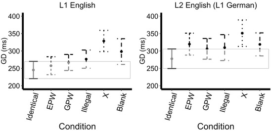 Likelihood-ratio model comparisons revealed a main effect of mask type (X2(5)=64.46, p<0.0001), a main effect of Language (X2(1)=49.09, p<0.0001) but no significant interaction (X2(5)=7.44, p=0.19). As shown by the successive comparisons, the GD increased from the Identical to the EPW mask (approaching significance t=2.15, p=0.03), the Illegal to the X masks t=3.55, p<0.001), and decreased from the X to the Blank mask (approaching significance, t=-2.13, p=0.03), with GD decreasing. Additionally, L2 speakers showing greater average GDs than L1 speakers (t=2.73, p<0.01). The model with the treatment contrasts (Identical set as the reference level) revealed that the Identical mask had a significantly shorter GD relative to all of the other masks: EPW (t=2.34, p=0.02, approaching significance), GPW (t=2.59, p<0.01), Illegal (t=2.47, p=0.01), X (t=6.02, p<0.0001), Blank (t=2.84, p<0.01). The L2 speakers showed a greater average GDs than L1 speakers (t=-2.36, p=0.02, approaching significance); see Figure 2. No further effects reached significance in GD; see Appendix B.