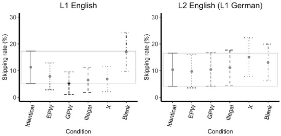 For skipping rate, the maximal model failed to converge and the slope for mask type was removed from the by-item random effects. Model comparison revealed a main effect of mask type (X2(5)=17.96, p<0.01), but no significant effect of language (X2(1)=0.00, p=1.00) or interaction (X2(5)=9.18, p=0.10). As shown by the successive comparisons, skipping rate decreasing from the Identical to the EPW mask (z=-2.71, p<0.01), increasing from the GPW to Illegal (z=2.27, p=0.02, approaching significance), and increasing from the Illegal to the X mask (z=2.60, p<0.01). Additionally, all covariates approached significance: skipping rate decreased as character length increased (z=-2.27, p=0.02), skipping rate decreased as OPT score increased (z=-1.94, p=0.05), and skipping rate increased as spelling score increased (z=1.94, p<0.05).