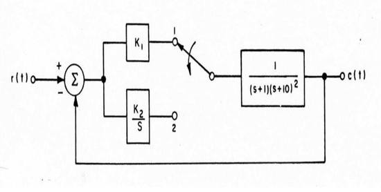In 1962, Mantgiaris began his studies into designing “a simple compensation scheme” so that “the process output closely approximate the process input when the latter is a step and that there be no steady state error.” The reference process was that of a chemical concentration control. His solution was to combine a short pure gain to achieve a fast response followed by integral compensation to assure no steady-state error (Mantgiaris, 1962; Mantgiaris, 1963). A switching arrangement was evolved to combine the desirable characteristics of both types of input. Figure 3 is the model shown with a second-order plant.