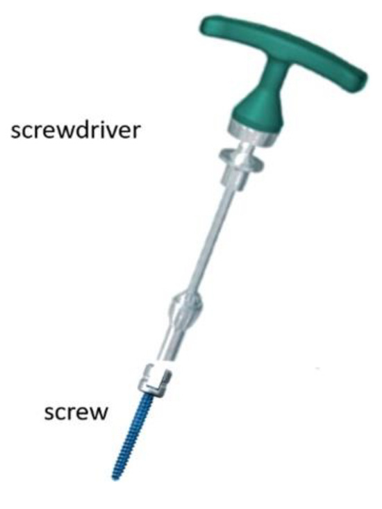 The main surgical tools used during the spondylosis screw placement. A specialized operational screwdriver (DePuy Synthes) is connected to the medical screw during placement and disconnected after the successful placement.