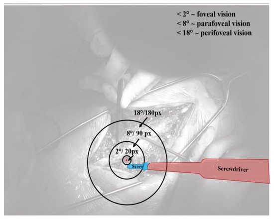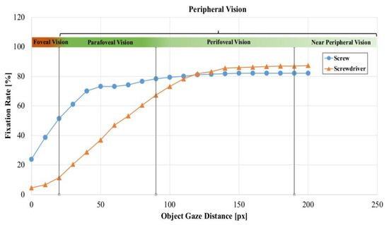 Expanding the analysis to inside the perifoveal field of vision (0 < 180 px), the FR of AOI screw was 82.1 % and the FR of AOI screwdriver was 86.9 %.