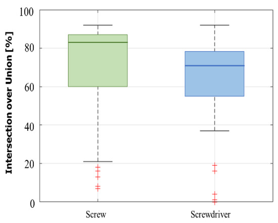 Boxplot showing the distribution of the calculated intersection over union (IoU) of the segmented masks for AOIs screw and screwdriver.