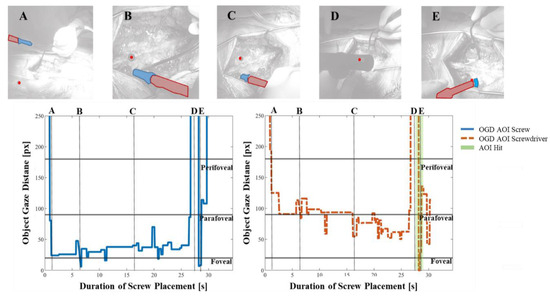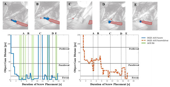 Figure 5 shows the OGDs of AOIs screw and screwdriver for the second exemplary screw placement procedure. Compared to the previous case, no AOI Hits were detected for AOI screw. The AOI was found within the parafoveal field of vision for the majority of the fixations. Images B and E show AOI screw inside the foveal field of view, while in images A and C it is located further away. In image D, the screw could not be detected by the neural network, which is reflected by a distance value of 1600 px.
