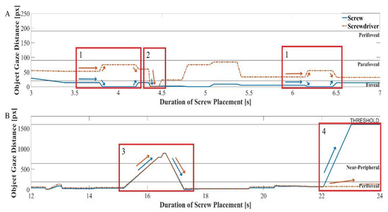 - The two task relevant objects have a different relative positions to the gaze point, AOI screw being closer and AOI screwdriver further away. An AOI Hit on AOI screw is made, moving the distance to 0 px, while the distance to AOI screwdriver increases. The gaze then reverts back to a similar position as before the AOI Hit. The distance curve behavior resembles a quick glance onto one object, possibly for status checking purposes. The pattern is shown twice in Figure 7 and was found 16 times (mean: 1.45 ± 0.89) over all procedures.