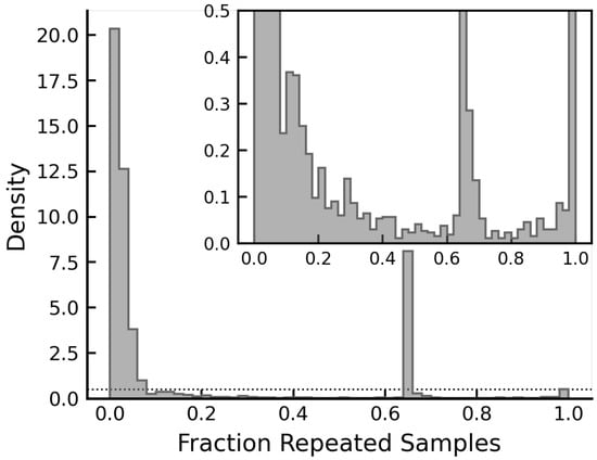 Frequency density histograms of the fraction of repeated samples in each trial (an indirect measure of invalid samples). The inset in the top right corner displays the same histogram with the y axis zoomed to a maximum value of 0.5 (dotted line) to better visualize small frequency densities beyond the three major clusters. Data shown includes all trials regardless of whether the left, right, or combined gaze representation had repeated samples.