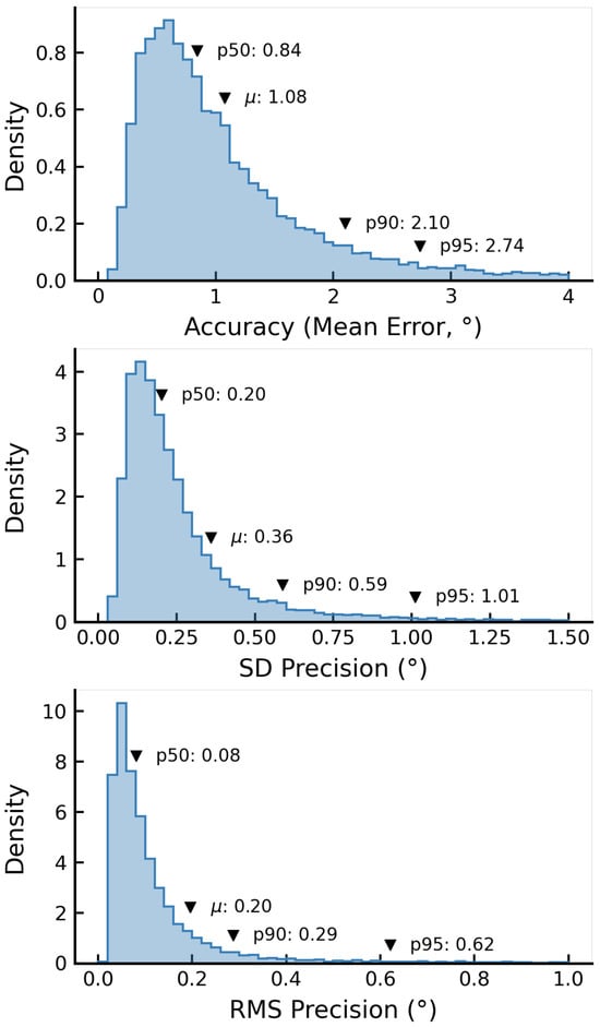 Frequency density histograms of accuracy and precision metrics across all validation trials (combined gaze). Top: Accuracy (average absolute error relative to target), Middle, Bottom: Precision (standard deviation and inter-sample root mean square error of gaze angles). Histograms are based on fixations to all presented target positions. Means and percentiles for each measure are annotated to allow direct comparison with device specifications. Data computed before outlier correction. Note: Plots are truncated at a specific x value (4°, 1.5°, and 1°, respectively) to better visualize the overall distributions and percentiles.