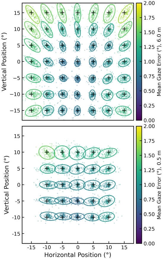 Average gaze position and 95% confidence ellipses for each target position, shown separately for the 6 m (top) and 0.5 m depth plane (bottom). Color scale illustrates average gaze accuracy in degrees across all trials presenting the corresponding target. Black crosses indicate target positions (cross arms approximate 1°).