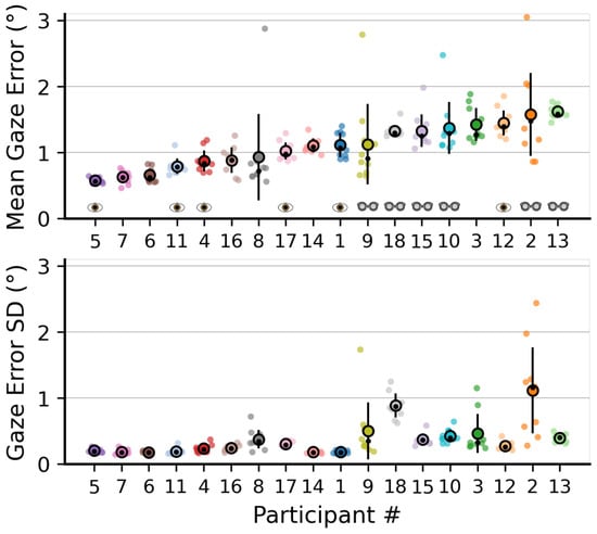 Accuracy (mean gaze error, top) and precision (standard deviation, bottom) of all individual participants. Small colored circles represent individual validation sessions. Large, open circles and error bars indicate mean and standard deviation across sessions, small black circles the median. Participants are sorted by average accuracy, numbers follow Table S1. Icons in the top panel indicate that a participant wore glasses or contact lenses (eye icon). Icons designed by OpenMoji (openmoji.org) under CC-BY-SA 4.0 license.