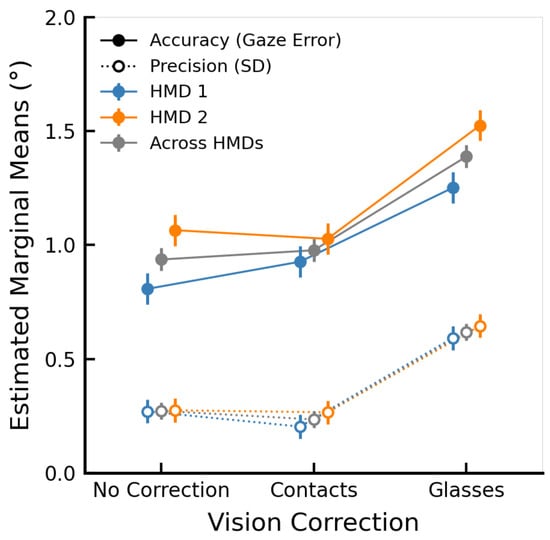 Figure 5 suggests that participants who wore glasses had lower gaze accuracy compared to those with contacts or uncorrected vision, evidenced by higher average gaze errors. To more closely evaluate how vision correction influences accuracy and precision metrics and explore whether individual HMD units differ in eye tracking performance, we fit a linear model with the factors vision correction × HMD. Estimated marginal means from this analysis for both accuracy and precision are shown in Figure 6 (colored markers and lines).