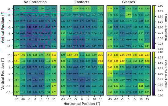Average gaze accuracy at each presented target position across the FOV, split between HMD 1 (top row) and HMD 2 (bottom row), as well as by vision correction (columns).