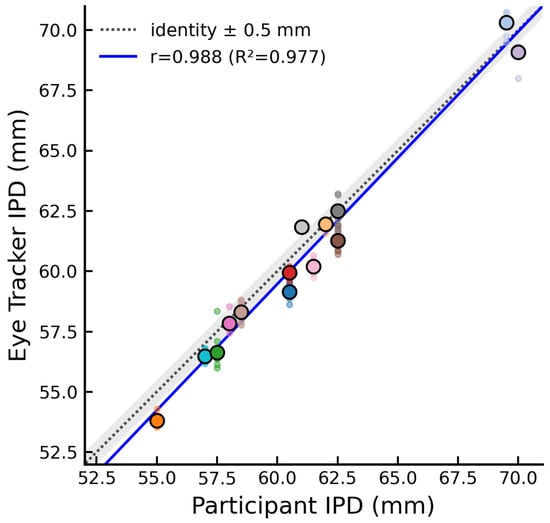 We extracted average 3D positions of the left and right pupil in the eye tracker’s frame of reference for each session and computed an estimate of IPD as the mean horizontal distance between both pupil positions. Figure 8 shows the individual sessions and mean IPD values extracted from gaze data as a function of each participant’s actual IPD value when measured using a pupilometer.