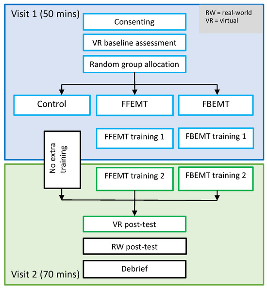 The study adopted an independent groups design (see design overview in Figure 1). Participants were randomly allocated to one of the three training groups (FFEMT, FBEMT, or control) and performed pre- and post-tests in the virtual environment. Following the recommendations of Karlsson and Bergmark (2015) for selecting the relevant causal contrast to the treatment group in randomised controlled trials, control participants were assigned to training as normal. Training as normal consisted of continuing with their close quarter battle training using synthetic physical environments, but no additional FBEMT or FFEMT. As the purpose of this trial was to determine whether FFEMT or FBEMT could be an effective addition to current training, training as usual provided the relevant baseline.