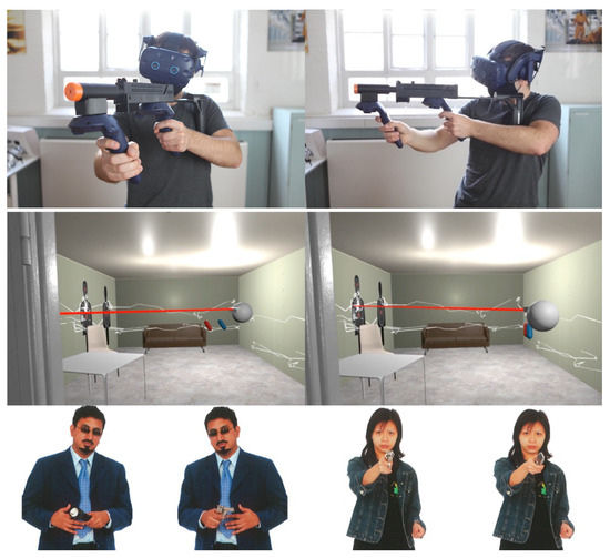 The VR environment was developed using the gaming engine Unity 2019.2.12 (Unity technologies, CA; https://unity.com/) and C#. The simulation was displayed using an HTC Vive Pro Eye headset (HTC, Taiwan; https://www.vive.com/uk/), a 6-degrees of freedom, consumer-grade VR system with a 110o field of view and 90Hz refresh rate. The Vive headset had built-in binocular eye tracking capability, which sampled at 120Hz over the whole field of view to an accuracy of 0.5-1.1o. Gaze was calibrated in VR over 5 points prior to the room clearance tasks. The position of the headset and handheld controllers were tracked using Steam VR and the controllers were used to animate a tracked weapon in the environment (see Figure 2 top). Room scale VR was used to match the virtual room to the real space to allow participants to move freely around the environment. Graphics were generated on an HP EliteDesk PC running Windows 10, with an Intel i7 processor and Titan V graphics card (NVIDIA Corp., Santa Clara, CA) and data were recorded in csv format for offline analysis.