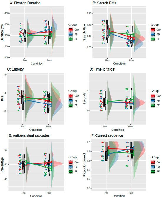 For entropy (see Figure 3C), the covariate was not significant [F(1,34) = 0.13, p = .74, η2 = 0.00] so was removed. There was an overall reduction in entropy from pre to post [F(1,35) = 9.33, p = .004, η2 = 0.06], but there was no effect of group [F(2,35) = 1.60, p = .22, η2 = 0.06], and no group-by-time interaction [F(2,35) = 1.35, p = .27, η2 = 0.02]. This suggests that all groups learned more structured search patterns over time and that the addition of feed-forward or feed-back eye movement training did not significantly accelerate this learning.