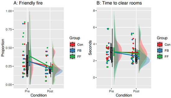 For the variable time to shoot hostiles, the covariate participant pool was significant [F(1,34) = 4.69, p = .04, η2 = 0.09] so was retained. There was no overall change in time to clear hostiles from pre to post [F(1,34) = 0.49, p = .49, η2 = 0.00], no effect of group [F(2,34) = 0.37, p = .69, η2 = 0.02], and no group-by-time interaction [F(2,34) = 0.52, p = .60, η2 = 0.01].