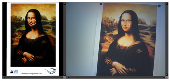 Gaze mapping in BeGaze. The left side shows the reference view and the right side shows one frame of the video of the scene camera with the fixation visualized as a circle. Source: SMI BeGaze Manual.