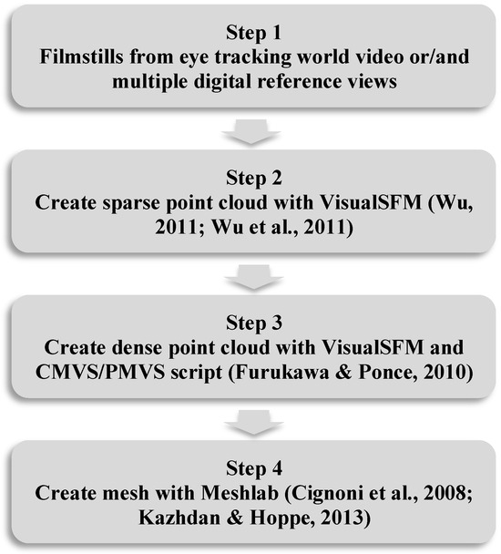 There are several methods to create a virtual 3D model using photogrammetry. For further analysis of the eye movements, it was necessary to choose a method that not only creates a 3D model, but also preserves the camera data. The chosen method consists of four steps. These steps and the used open-source programs are shown in Figure 2.