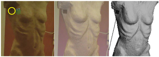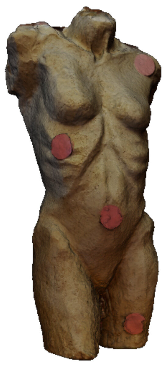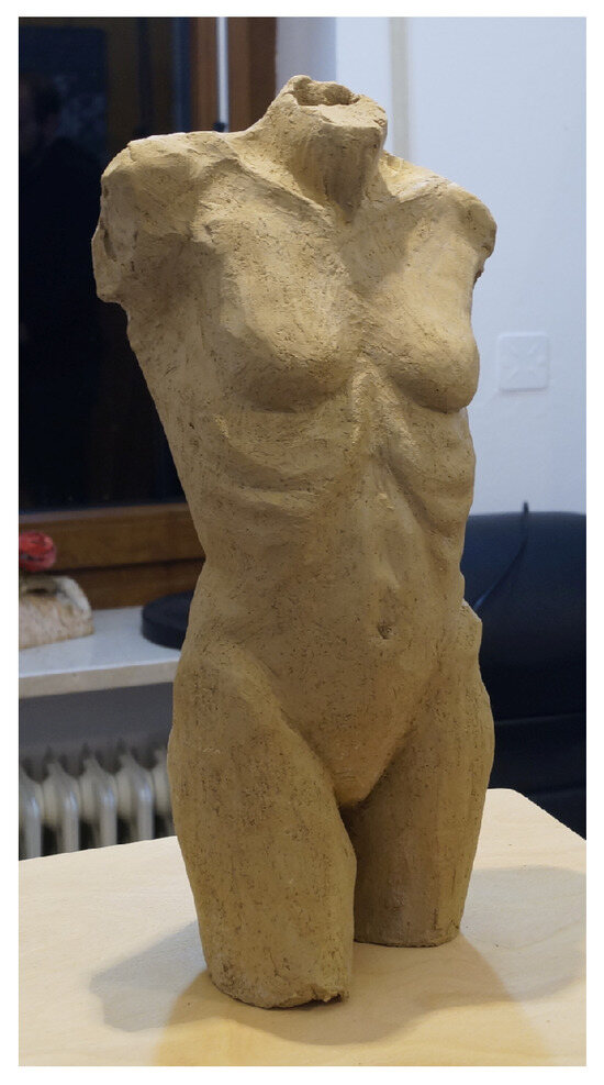 The first step of the workflow involves taking multiple pictures of the stimulus from different perspectives. The stimulus for our exploration was a clay-based artwork showing a female torso (Stein, 2018). 86 pictures of the torso (see an example in Figure 3) were used to create a virtual 3D model of the stimulus.