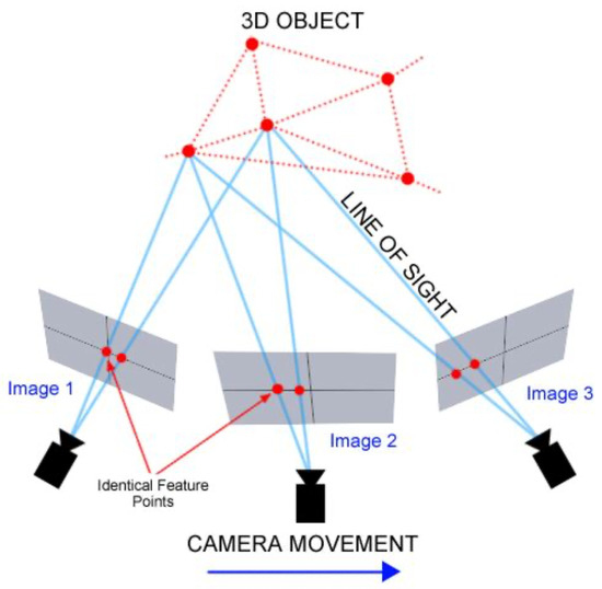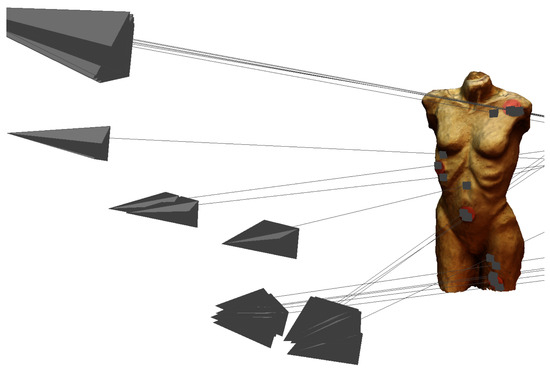 In the second step of the workflow, the multiple images are loaded into the open-source program VisualSFM (Wu, 2011; Wu et al., 2011). The SfM technique, which is the basis of VisualSFM, computes a sparse point cloud of the stimulus. In other words, this means that identical feature points in the different images are identified and these feature matches are computed in VisualSFM. These identical feature points are needed to calculate the relationship between the different origins and perspectives of the pictures (see Figure 4).