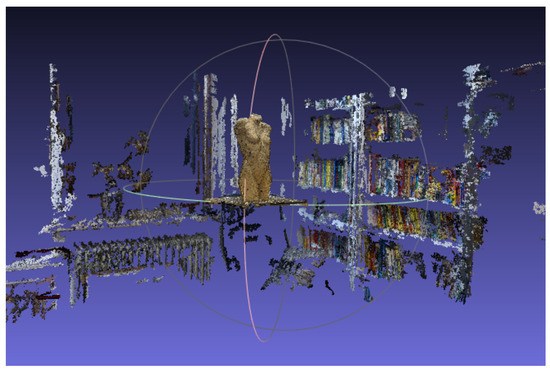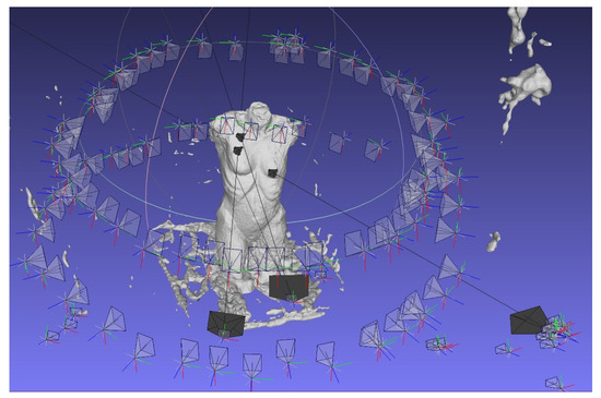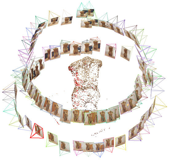 Figure 5 shows such a sparse point cloud and displays that VisualSFM computes the different origins of the pictures or frames, which were loaded into the program. One can see the origins of the 86 pictures of the digital camera in two circles around the stimulus.