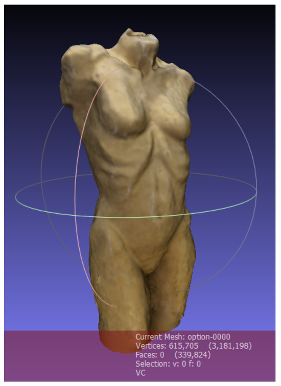 In Meshlab, the user can generate a virtual 3D model with a textured surface using the so-called Poisson surface reconstruction (Kazhdan & Hoppe, 2013). The point cloud is computed to a mesh with vertices, edges and faces. The result is a complete copy of the 3D stimulus, which even has the surface structure and texture of the original stimulus. It is also possible to display the mesh without the texture in Meshlab, depending on the analysis the researcher addresses. In Figure 8, the 3D model of the stimulus with a textured surface is displayed.