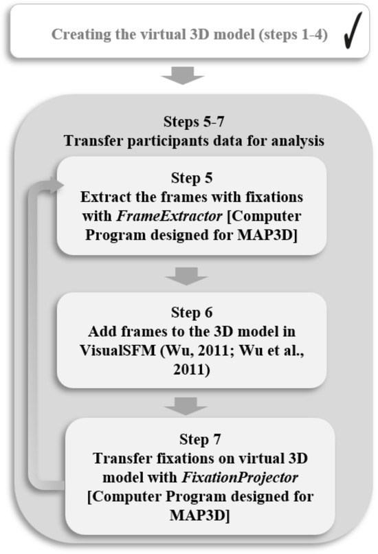 To be able to analyze the eye movements on the created virtual 3D model, the fixations of each participant have to be transferred to the 3D model. Therefore, the fixation frames have to be extracted (step 5), added to the 3D model (step 6) and projected to the 3D model (step 7) for each participant (see Figure 9).