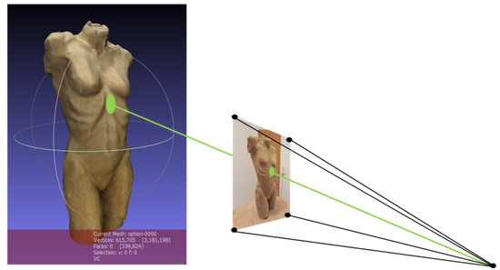 To perform the seventh step, it is important to recall that photogrammetry detects the origin of every single picture used for creating the 3D model. The frames are taken from the scene camera of the eye tracker. The eye tracker also provides the subject’s angle of view in relation to the scene camera’s image. Combining the original location of the frame, which corresponds to the participant’s point of view, with the viewing angle, the location of the fixation can be determined. This is done by determining the intersection point of the straight line (visual beam) with the surface of the 3D model (see Figure 11).