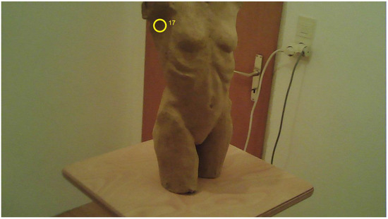 To visualize the output of the FrameExtractor, the MAP3D FixationMarker was created as an evaluation tool. Using the x and y coordinates from the fixation.csv file obtained from the Pupil Labs software, the FixationMarker marks the corresponding fixation in all images extracted by the FrameExtractor. The fixation is visualized with a yellow circle and the corresponding fixation ID (see Figure 14). Now, the yellow circle from the FixationMarker in Figure 14 can be compared with the yellow circle of the fixation point output from Pupil Labs shown in Figure 13. The two circles are congruent in the same place on the torso.