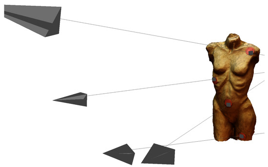 The coordinates of the intersection points are additionally written in a .csv file. These 3D fixations are available as a point cloud in a .ply file. Additionally, a MeshLab project file is created containing the 3D model as well as all fixations of the participant and all so-called raster cameras, meaning all cameras used by photogrammetry. Figure 12 displays how the FixationProjector calculates three fixations hitting the 3D model.