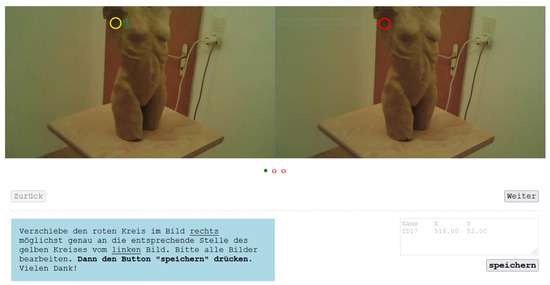 The manual mapping was carried out in an HTMLbased program (see Figure 23). The program collected the x and y coordinates of the respective red circle. Thus, it was possible to compare the accuracy of the manual mapping with the automatic mapping of the MAP3D FrameExtractor. The deviation in pixel from the x and y coordinates of the fixation provided by Pupil Labs was calculated.
