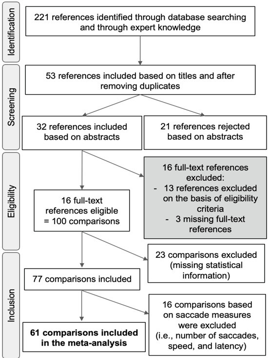 Thirdly, although we did not apply any criteria relating to the type of population, most of the studies included adult participants. Finally, the study had to report eye-movement data collected during the music-reading task as well as the types of eye-movement measures and the recording device. Last but not least, because the parameters could vary from one study to another, the types of musical stimuli had to be clearly reported. This step generated 16 eligible studies, leading to a total of 100 comparisons of eye-movement measures between expert and non-expert musicians.