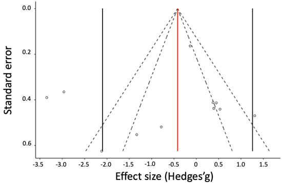 Weighted mean effect size – Primary analyses were conducted on 29 effect size estimates from 10 different studies. The overall weighted mean effect size across all estimates was g = -1.42 (95% CI [-2.96, 0.12], p = .066) with a between-study standard error of 0.68. Furthermore, heterogeneity was substantial (Higgins’ I² = 90.18%). The huge confidence interval and large standard deviation, as well as the high degree of heterogeneity and asymmetrical funnel plot, suggested the presence of outliers with extreme values in this subset.