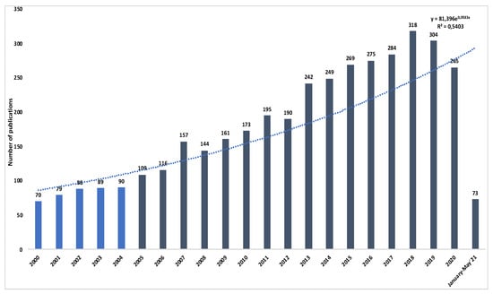 As shown in Figure 1, the number of publications on eye movements increased exponentially since 2005, more than 100 publications per year, (1976–2004: 19.7% of publications; 2005–2021: 80.2% of publications). 2018 was the year with the highest number of publications: 318 publications and 10 citation networks.