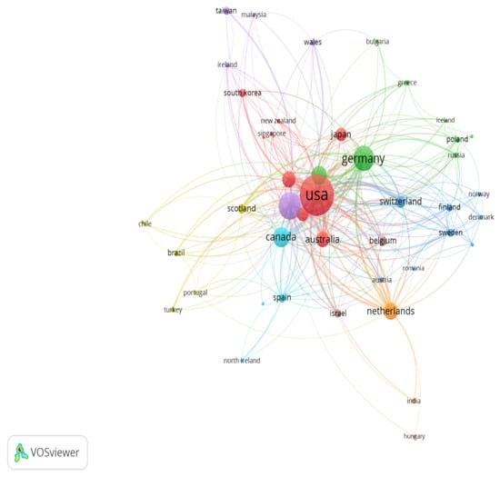 Of all publications, 84.8% were articles, 6.1% were proceedings papers, 5.9% were reviews, and the remaining 3.2% were meeting abstracts, book chapter or editorial materials. With regards to the language of the publications, 99% were in English, 0.8% were in German and the remaining 0.2% were in Russian. As shown in Figure 2 and Table 2, the countries with the highest number of publications were the United States (33.9%), England (14.9%) and Germany (13.1%). Figure 2 shows the collaboration amongst countries, as well as the group they belong to. The colour of an article represents the group they belong to and the lines among elements represent their strength.