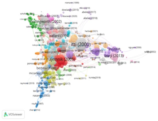 Table 1 shows the 20 most cited publications within this citation network. The most cited article was written by Deubel et al. (1996), which was published in 1998 and has a citation index of 213. This article analysed the spatial interaction and the saccadic movements of the eyes. Therefore, the data showed that visual discrimination is better when the discrimination stimuli and the saccadic movement move toward the same object. That is to say, it is difficult to direct the attention to the object that is being discriminated whilst the saccadic movement moves towards another close object. In conclusion, the obtained data highlighted the importance of a compulsory and selective link between the saccadic programming and the visual attention towards an object in common.