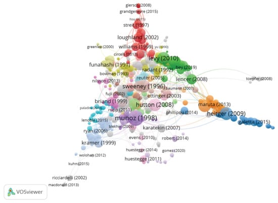 Therefore, once the bibliography had been downloaded from the WOS database, the CitNetExplorer software allowed us to collect and analyse every available piece of literature on ocular motility from 1900 to May 2021. In addition, it was also possible to obtain the connections between the fields of study and the different research groups by analysing the citation networks. The “Clustering” function allowed us to obtain the results and group the publications according to the links between the citations. The “Core publications” function was used to select the most cited publications (that is, those studies with a minimum number of citations). Those publications with 4 or more citations were selected according to other studies (). All these functions allow for a complete analysis of the publications related to the research field of interest (in this case, ocular motility).
