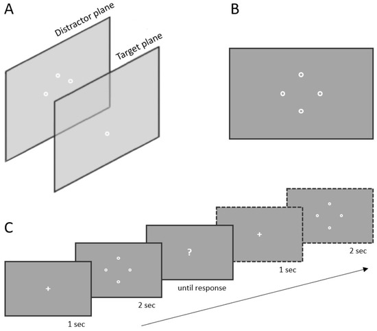 (A) Side view and (B) front view of the item layout. The target was displayed one plane closer to the viewer (Target plane) compared to distractors (Distractor plane) within the optical element of the multiplane display. (C) The visual task sequence. The fixation cross appeared for one second at the beginning of each trial. Then four circles were shown on the screen. The trial finished with the submission of the subject’s response when the question mark was shown. The illustrations are not to scale.