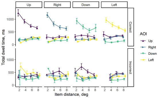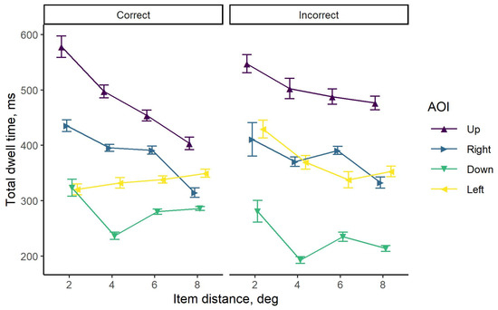 As for 2D images (target-absent trials), group means for total dwell times are summarized in Figure 5. A similar pattern is observed when comparing total dwell times across tasks with correct and incorrect responses. Namely, the longest dwell times were observed for AOIs containing the upper item at all item distances, and the shortest dwell times for AOIs containing the lower item.