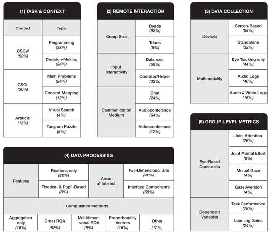 Dimension 3: Data Collection. According to the focus on computer-mediated collaboration, only desktopmounted eye trackers were used in the studies. These were either screen-based devices integrated into monitors (68%) or standalone devices set up next to the screen (32%). Moreover, most studies not only captured participants’ eye movements (44%), but also other communication signals, such as speech and body language by recording audio (40%) and video logs (16%).