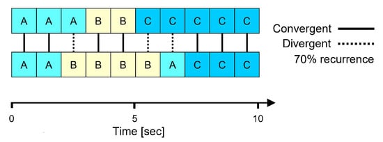 Exemplary time series of two participants with assigned AOIs (A, B, or C) per one-second intervals. The time series show a 70% recurrence as gaze converged in seven out of ten intervals.