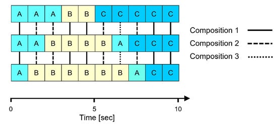 Exemplary time series of three participants with assigned AOIs (A, B, or C) per one-second intervals. Shown are episodes in which three participants look at the same AOI (composition 1; 50% recurrence), only two participants look at the same AOI (composition 2; 40% recurrence), and three participants divide their gaze between the AOIs (composition 3; 10% recurrence).