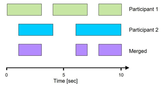 Alternative Approaches. Sharma et al. (2012) introduced a segmentation method to distinguish between convergent and divergent episodes during dyadic interaction. This was accomplished by initially splitting each participant’s time series into equal slices. In a further step, consecutive slices with the same amount of fixated AOIs were accumulated and segmented as prolonged sequences of stable patterns. Next, the segmented series of both participants were temporally aligned in order to identify and merge intersections into a new time series of convergent episodes (see Figure 8).