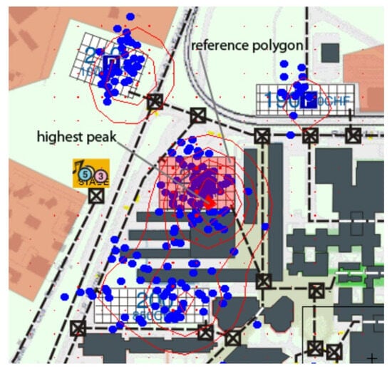 Illustration from Cherubini et al. (2008): Shown are the participants’ gaze positions (blue) and plots of the contour function used to compute the gaze density peaks (red).
