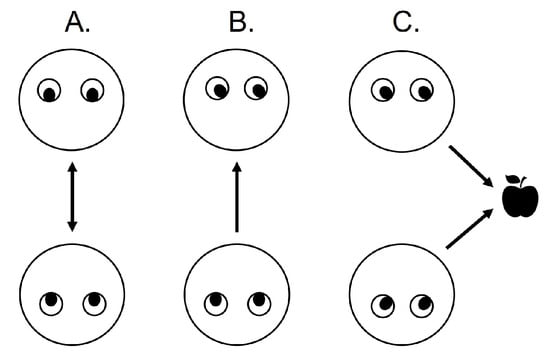 Adapted from Pfeiffer et al. (2013): Mutual gaze (A; two individuals look at each other), gaze aversion (B; one individual looks at another who looks away), and joint attention (C; at least two individuals look at the same object).