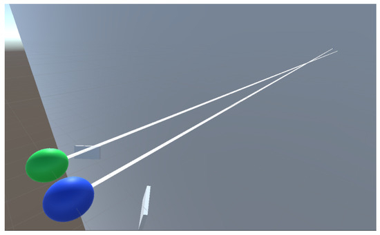 To simulate gaze vectors, we used Unity with the scripting language C#, to cover all the heavy lifting with 3D geometry as well as visualization. A brief explanation of the use of Unity in this work can be found in the appendix. In contrast to eye image synthesis (Nair et al., 2020), (Kim et al., 2019), (Wood et al., 2016), our purpose does not necessitate a full eye model. The representation as a simple sphere is fully sufficient and numerical output is much faster to calculate than graphical renderings. We created a scene with two spheres that represent the eyes, a plane with a point that serves as a fixation point, and dummies for the eye cameras. Figure 2 shows the scene.