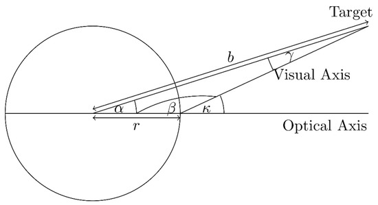 To include an individual offset between optical and visual axis (the line through pupil centre and fovea), we need to simulate the κ angle. We simulate a horizontal and vertical angle: κℎori, κvert. Since the spheres can only be rotated at their centre, we have to calculate this angle. Figure 3 shows a sketch of the situation.